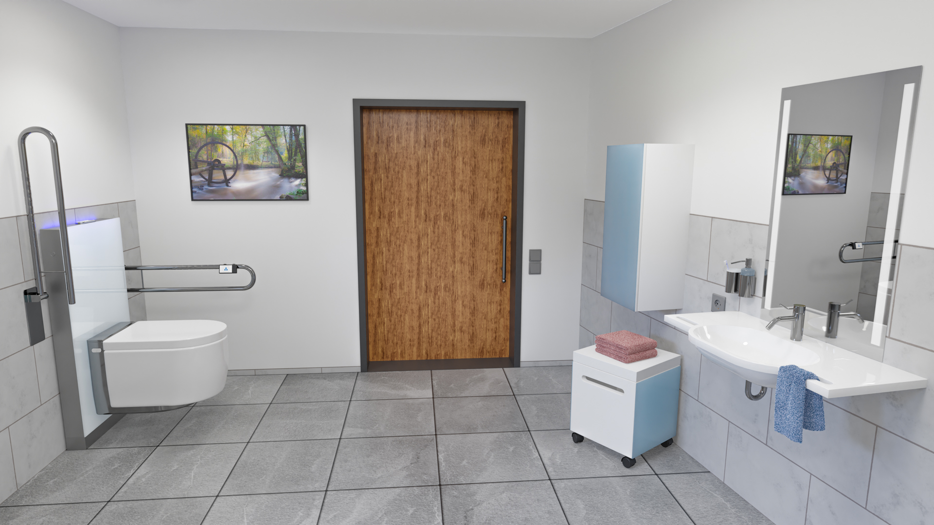 Der Waschtisch soll unterfahrbar sein und genügend Beinfreiheit für Rollstuhlnutzer und sitzende Personen bieten. Höhenverstellbare Waschtische bieten zusätzlichen Komfort und ermöglichen eine individuelle Anpassung. Eine gute Option sind Waschtische mit integrierten Haltegriffen und zusätzlichen Ablagemöglichkeiten, da man sich auch direkt am Tisch festhalten kann. Der Spiegel sollte für sitzende Personen ausgerichtet sein und unmittelbar über dem Waschtisch beginnen. Eine zusätzliche seitliche Spiegelbeleuchtung spendet ausreichend Licht.